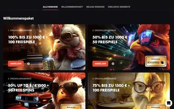 Wir halten Aktionen strukturiert, damit du den Wert und die wichtigsten Regeln sehen kannst, bevor du teilnimmst. Jedes Angebot zeigt die Mindesteinzahlung, die Bonusobergrenze und eine eventuelle Umsatzanforderung. So funktionieren unsere Hauptdeals fĂĽr Spieler aus Deutschland bei RoosterBet Casino.