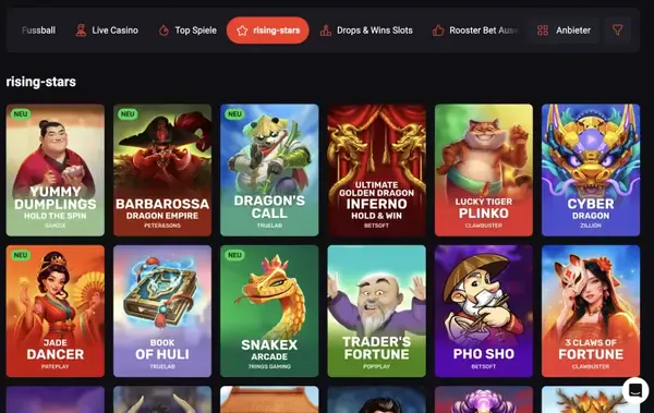 Unsere Lobby umfasst rund 10.000 Spiele aus den Bereichen Slots, Live-Casino, Tischspiele, Jackpots und Fast-Play-Titel. Im RoosterBet Casino kannst du nach Anbieter, Feature oder Kategorie filtern, um schneller zu Neuerscheinungen und bekannten Klassikern zu gelangen. Wir hosten Studios wie Pragmatic Play, Evolution, Play’n GO, NetEnt, BGaming, Nolimit City, Betsoft, Yggdrasil, Wazdan und Spinomenal. Während unser Gesamt-RTP nicht öffentlich geprüft wird, werden viele einzelne RTP-Werte in der Hilfeansicht des jeweiligen Spiels angezeigt.