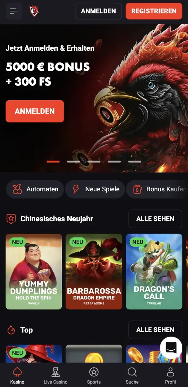 Die mobile Website enthält dieselben Kernfunktionen wie die Desktop-Version: Spiele, Kasse, Aktionen und Support. Unser Layout ist responsiv, das heißt, es passt sich deiner Bildschirmgröße an und wechselt sauber zwischen Hoch- und Querformat. Wenn du später Zugriff mit einem Tipp willst, kannst du trotzdem eine Verknüpfung erstellen und sie wie ein RoosterBet App-Icon verwenden.